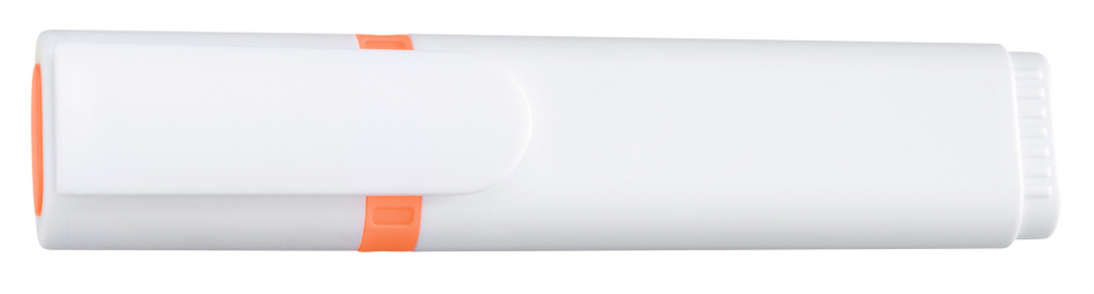 Textmarker mit Kunststoffgehäuse, Kappe und Clip in weiß. Mundstück mit Zierring und Stopfen in der Schreibfarbe. Standardfarben gelb, grün, magenta, blau, orange.