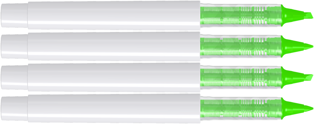 Flüssig-Textmarker mit Gehäuse aus recyceltem PET-Material in gedeckt glänzend weiß oder schwarz. Stopfen in den 6 möglichen Schreibfarben.