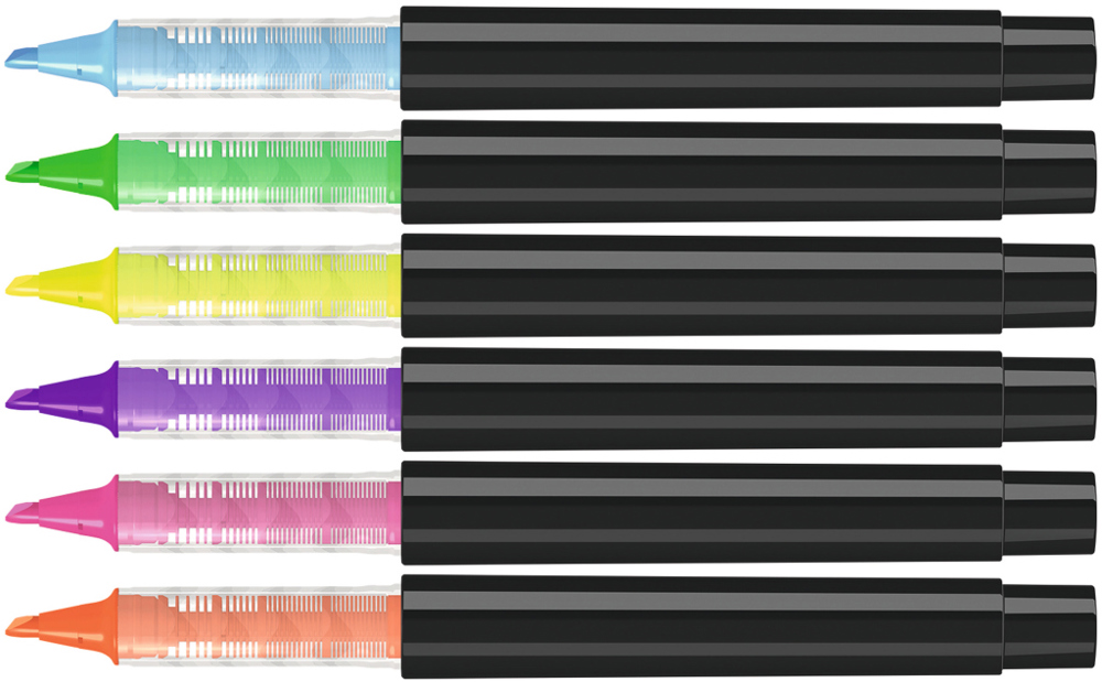 Flüssig-Textmarker mit Gehäuse aus recyceltem PET-Material in gedeckt glänzend weiß oder schwarz. Stopfen in den 6 möglichen Schreibfarben.