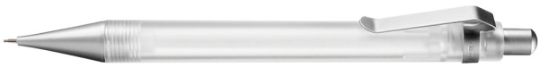 Druckbleistift (0,7mm) mit transparent gefrostetem oder gedecktem Gehäuse. Metalldrücker, Metallclip und Metallspitze matt verchromt.