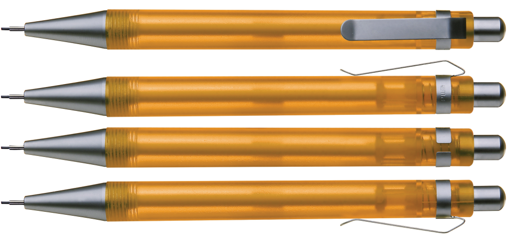 Druckbleistift (0,7mm) mit transparent gefrostetem oder gedecktem Gehäuse. Metalldrücker, Metallclip und Metallspitze matt verchromt.