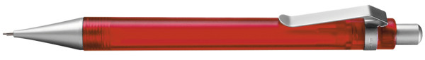 Druckbleistift (0,7mm) mit transparent gefrostetem oder gedecktem Gehäuse. Metalldrücker, Metallclip und Metallspitze matt verchromt.
