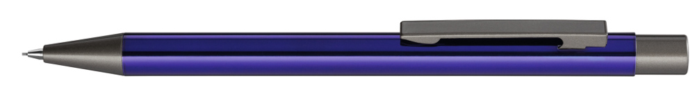 Metall-Druckbleistift (0,7mm) mit glänzendem Gehäuse. Metallclip, Metallspitze und Drücker GUN metallic. Radiergummi im Drücker.