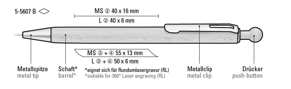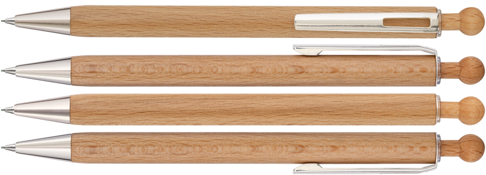 Holz-Druckbleistift (0,7mm) mit Holz-Kugeldrücker, Metallclip und Metallspitze silber glänzend. Schaft und Drücker aus schutzlackiertem PEFC-zertifiziertem Buchenholz.