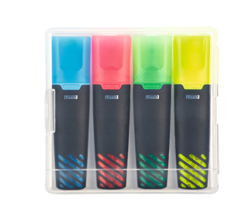 Flüssig-Textmarkerset bestehend aus 4 LIQEO HIGHLIGHTER in einer klar transparenten Kunststoffverpackung. Standardfarben der Textmarker in gelb, grün, magenta und blau. Optional wählbare Textmarkerfarben: orange und violett.