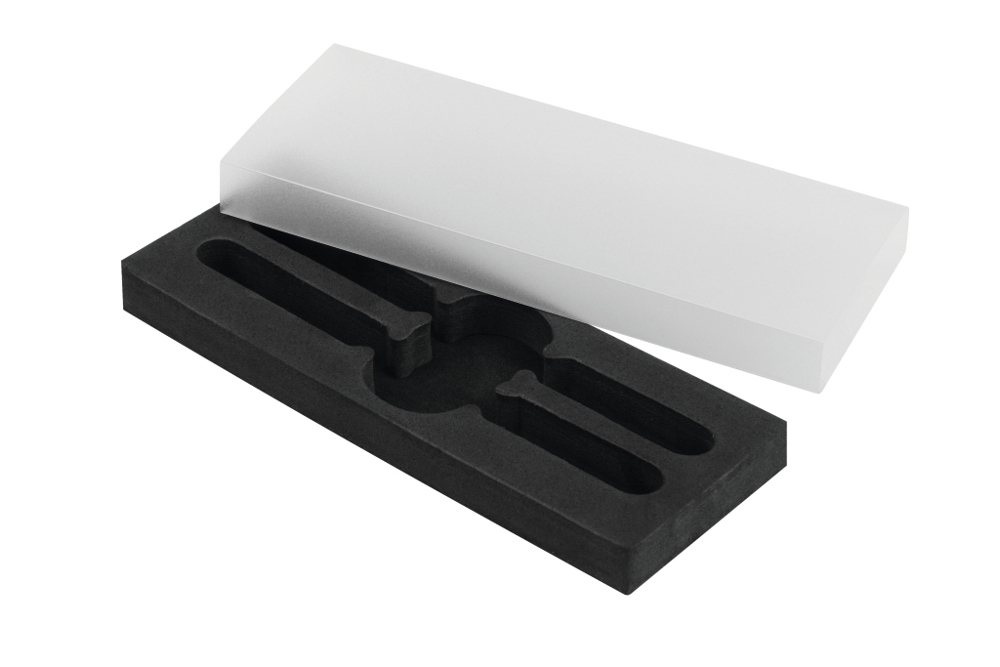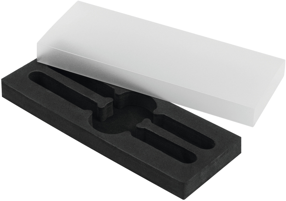 Etui mit EVA-Einlage für 2 Schreibgeräte mit transparent gefrostetem Kunststoffschuber.