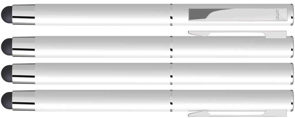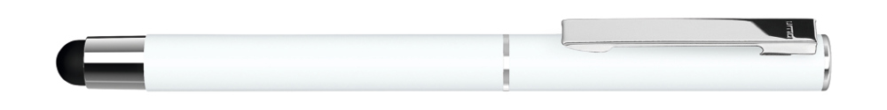 Metall-Rollerball mit mattem Gehäuse. Metallclip und Zierring silber glänzend, Griffzone schwarz. Gummiertes Schaftende für die Touchscreensteuerung.