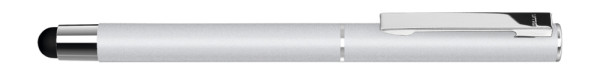 Metall-Rollerball mit mattem Gehäuse. Metallclip und Zierring silber glänzend, Griffzone schwarz. Gummiertes Schaftende für die Touchscreensteuerung.