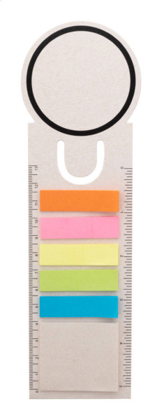 Lesezeichen aus recyceltem Milchkarton mit Linealfunktion, 15 Haftnotizzetteln und 75 Seitenmarkern (in 5 unterschiedlichen Farben).