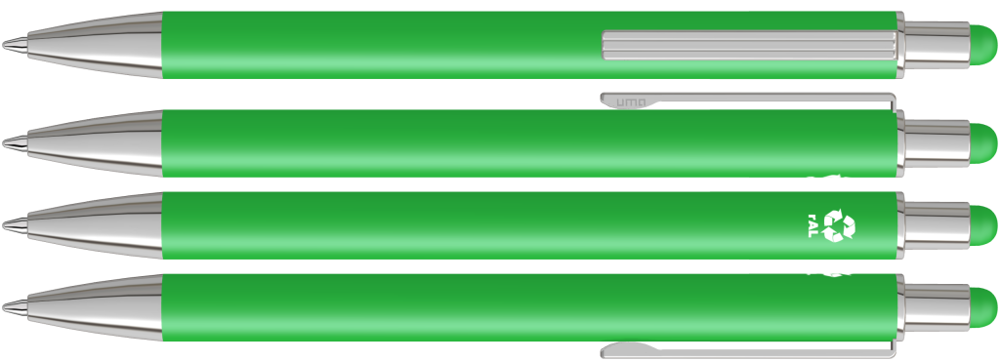 Metall-Druckkugelschreiber mit matter Oberfläche aus recyceltem Aluminium. Metallclip mit eingelassenen Rillen, Metallspitze in silber glänzend und Drücker mit integrierter Touchscreensteuerung.