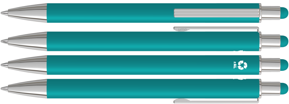 Metall-Druckkugelschreiber mit matter Oberfläche aus recyceltem Aluminium. Metallclip mit eingelassenen Rillen, Metallspitze in silber glänzend und Drücker mit integrierter Touchscreensteuerung.
