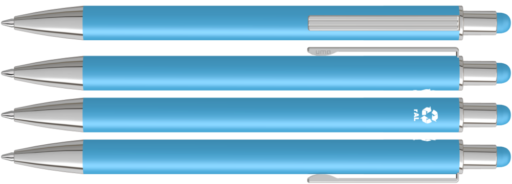 Metall-Druckkugelschreiber mit matter Oberfläche aus recyceltem Aluminium. Metallclip mit eingelassenen Rillen, Metallspitze in silber glänzend und Drücker mit integrierter Touchscreensteuerung.