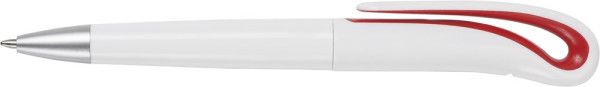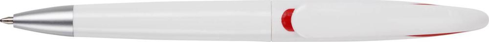 Drehkugelschreiber aus Kunststoff, weiß mit farbigen Akzenten und schwarzer Mine.