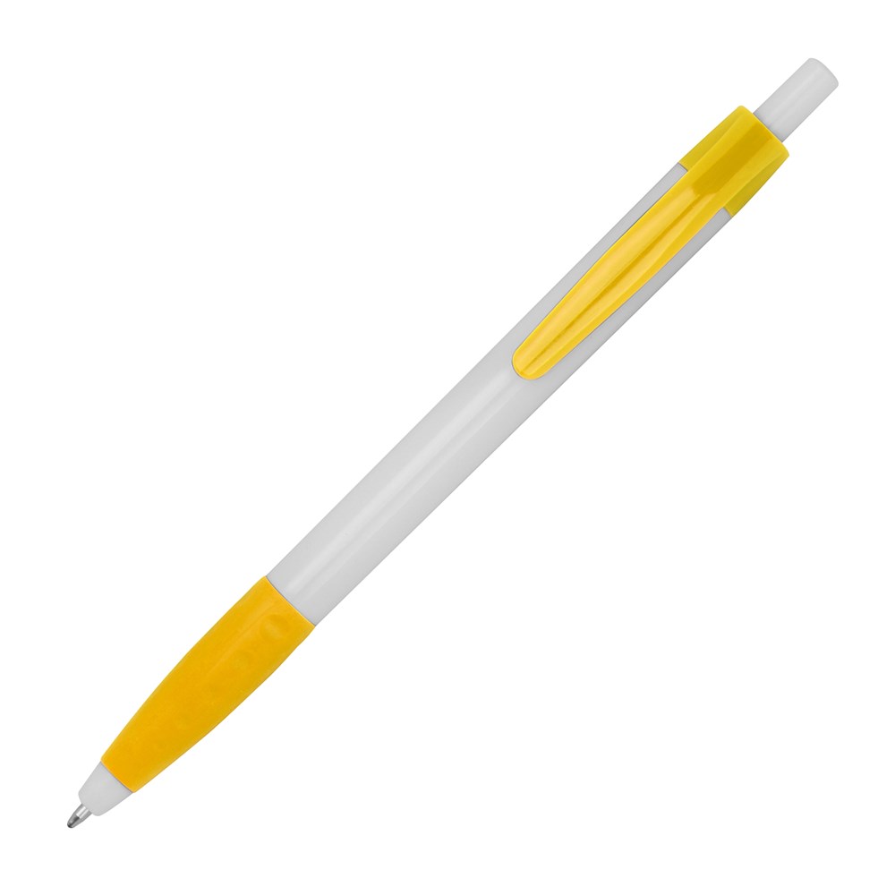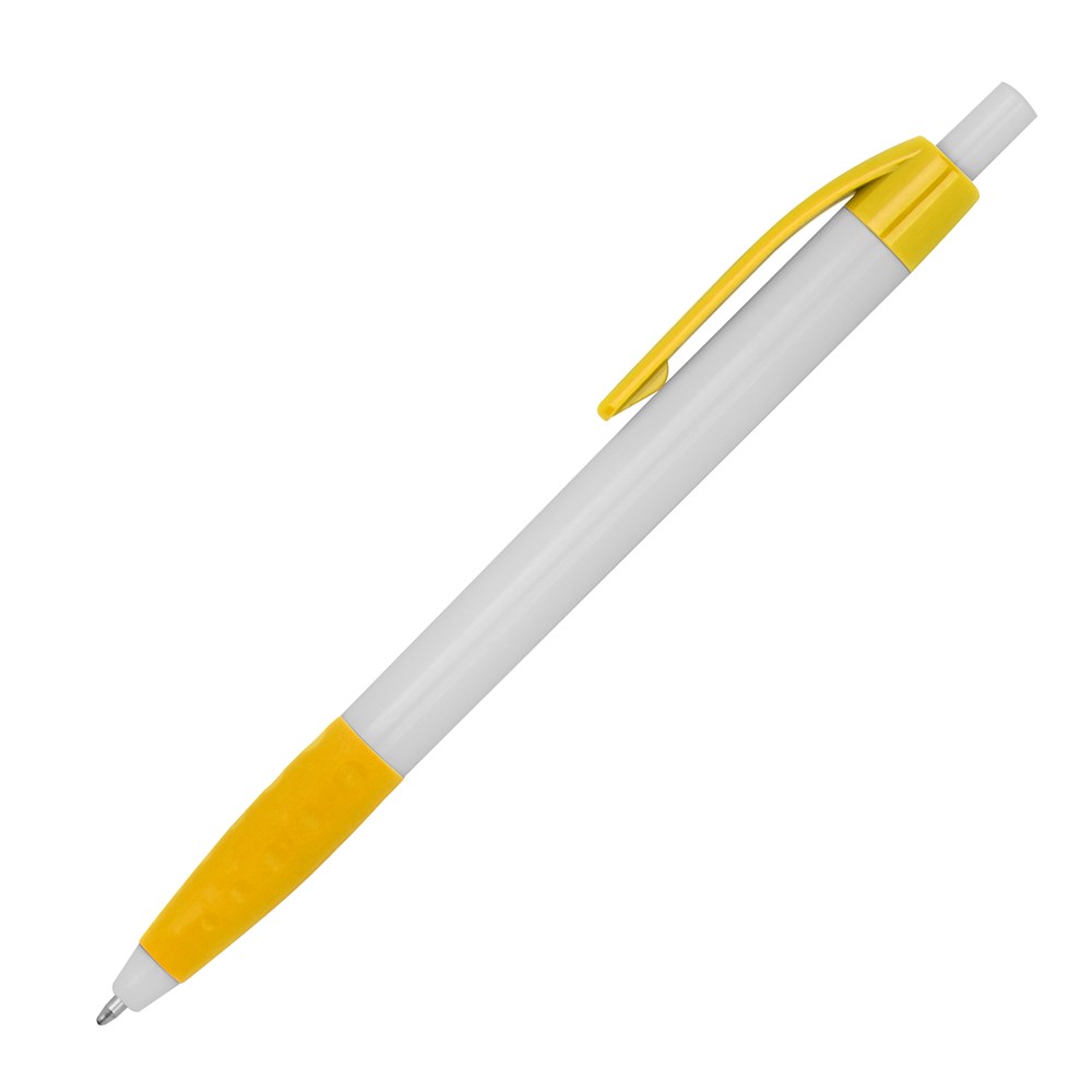 Kugelschreiber aus Kunststoff mit farbigen Akzenten und einer gummiertem Griffzone. Der Kugelschreiber verfügt über eine blauschreibende Kunststoffmine. Ihre Werbung drucken wir rechts vom Clip.