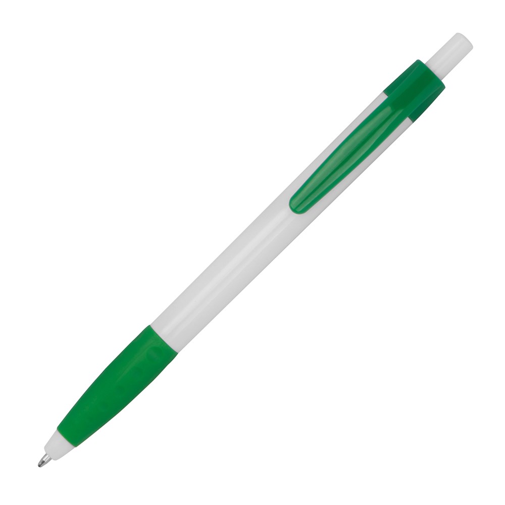 Kugelschreiber aus Kunststoff mit farbigen Akzenten und einer gummiertem Griffzone. Der Kugelschreiber verfügt über eine blauschreibende Kunststoffmine. Ihre Werbung drucken wir rechts vom Clip.