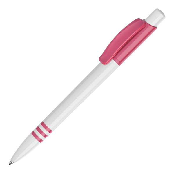 Der Hardcolour Kugelschreiber Tropic hat eine große Druckfläche auf dem Clip und dem Schaft. Eine ansprechende Kombination aus weißem Schaft und weißem Drücker sowie einem farbigen Clip. Der Schaft hat drei farbige Ringe in der gleichen Farbe wie der Clip. Druckkugelschreiber ausgestattet mit einer blau schreibenden Jumbo-Refill-Mine. Der Stift besteht aus ABS-Kunststoff und wird in Europa hergestellt. Ab einer Abnahmemenge von 5.000 Stück sind eigene Farbkombinationen möglich.