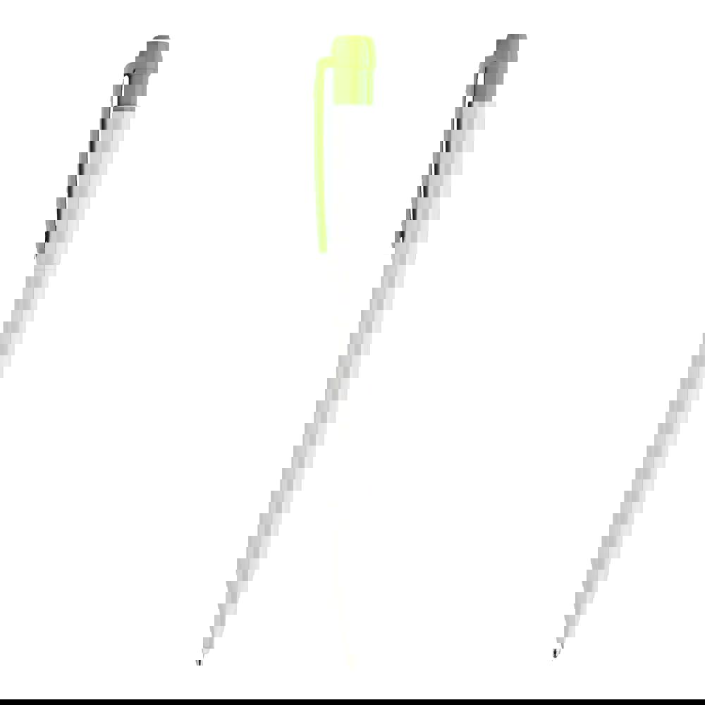 Schlanker weißer Hardcolour-Kugelschreiber mit farbigem Clip. Ein ansprechender Werbeartikel wegen seiner Druckfläche. Mit synthetischer blau schreibender X20-Refill-Mine. Druckkugelschreiber aus ABS, hergestellt in Europa. Ab einer Abnahmemenge von 5.000 Stück sind eigene Farbkombinationen möglich.
