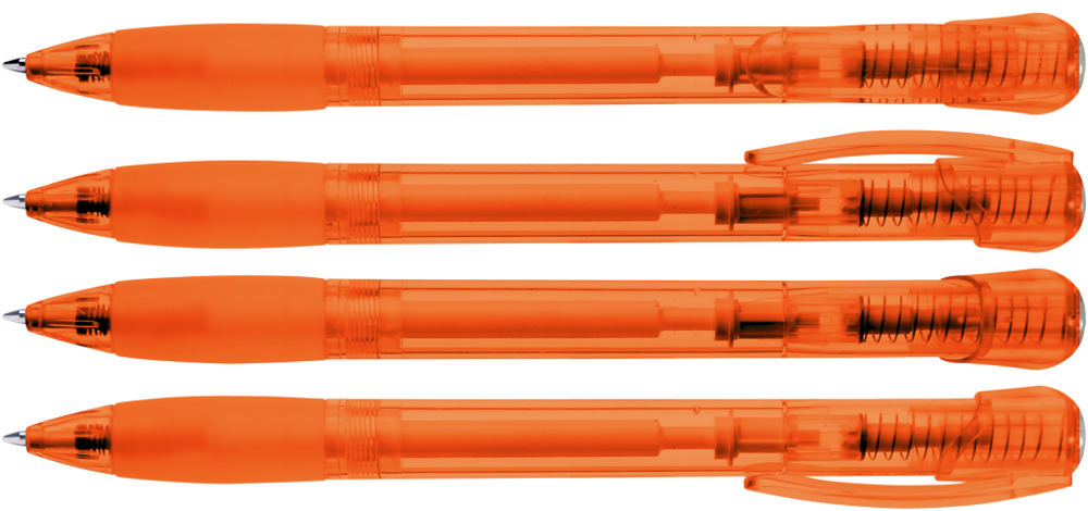 Druckkugelschreiber mit transparent glänzendem Gehäuse, Gummigriffzone und Clipdrücker. Stopfen... mehr
