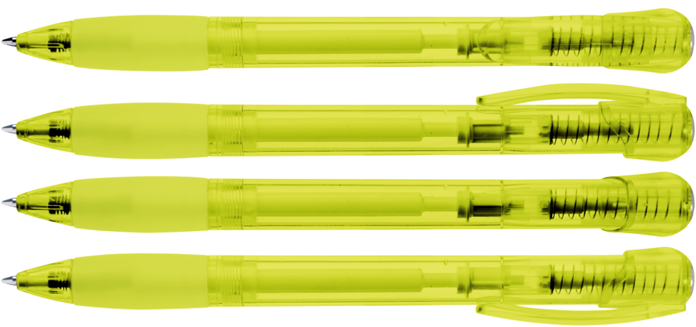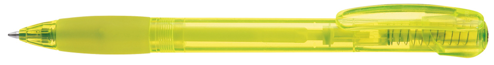 Druckkugelschreiber mit transparent glänzendem Gehäuse, Gummigriffzone und Clipdrücker. Stopfen... mehr