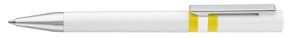 Drehkugelschreiber mit gedeckt glänzendem Gehäuse in weiß, farbig eingelassene Ringe und Stopfen im Oberteil. Metallclip und Spitze in silber glänzend.