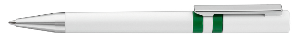 Drehkugelschreiber mit gedeckt glänzendem Gehäuse in weiß, farbig eingelassene Ringe und Stopfen im Oberteil. Metallclip und Spitze in silber glänzend.