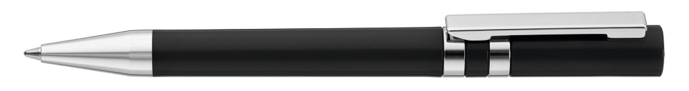 Drehkugelschreiber mit gedeckt glänzendem Gehäuse. Eingelassene Ringe, Stopfen im Oberteil, Metallclip und Spitze in silber glänzend.