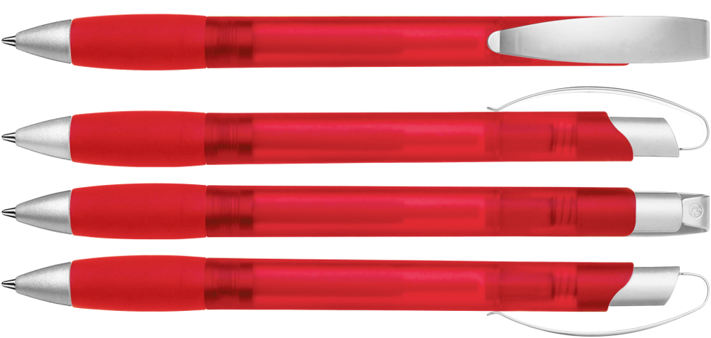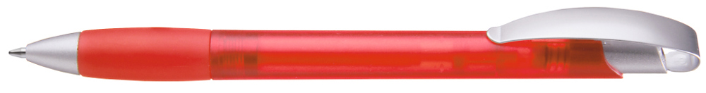 Druckkugelschreiber mit transparent gefrostetem Gehäuse, Gummigriffzone, matt verchromtem Metallclipdrücker und Spitze matt silber.