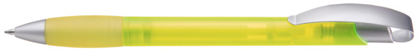 Druckkugelschreiber mit transparent gefrostetem Gehäuse, Gummigriffzone, matt verchromtem Metallclipdrücker und Spitze matt silber.