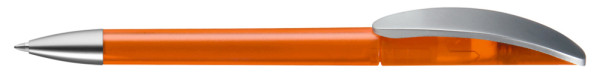 Drehkugelschreiber mit transparent gefrostetem oder gedeckt mattem Gehäuse, Bogenclip silber matt und schwerer Metallspitze matt verchromt.