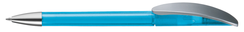Drehkugelschreiber mit transparent gefrostetem oder gedeckt mattem Gehäuse, Bogenclip silber matt und schwerer Metallspitze matt verchromt.