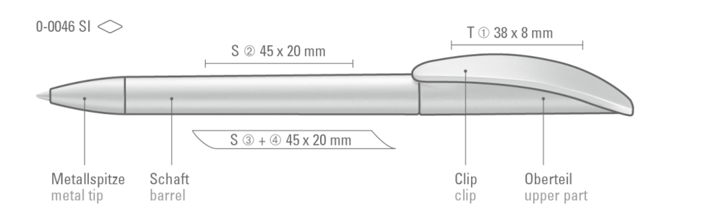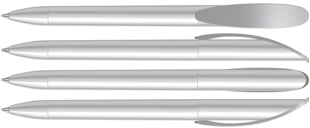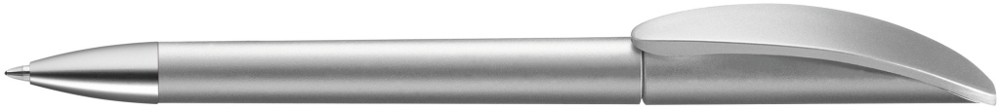 Drehkugelschreiber mit gedeckt silbernem Gehäuse, Bogenclip silber matt und schwerer Metallspitze matt verchromt.