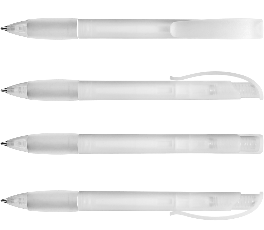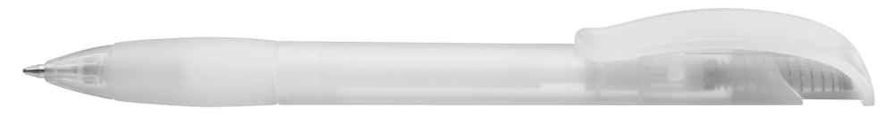 Druckkugelschreiber mit transparent gefrostetem Gehäuse, Gummigriffzone und Clipdrücker mit Stopfen.
