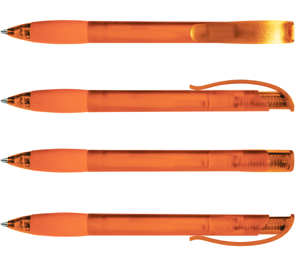 Druckkugelschreiber mit transparent gefrostetem Gehäuse, Gummigriffzone und Clipdrücker mit Stopfen.