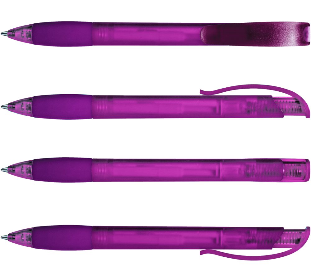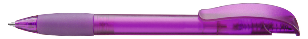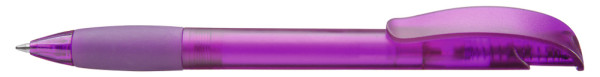 Druckkugelschreiber mit transparent gefrostetem Gehäuse, Gummigriffzone und Clipdrücker mit Stopfen.