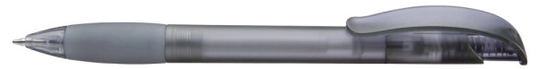 Druckkugelschreiber mit transparent gefrostetem Gehäuse, Gummigriffzone und Clipdrücker mit Stopfen.