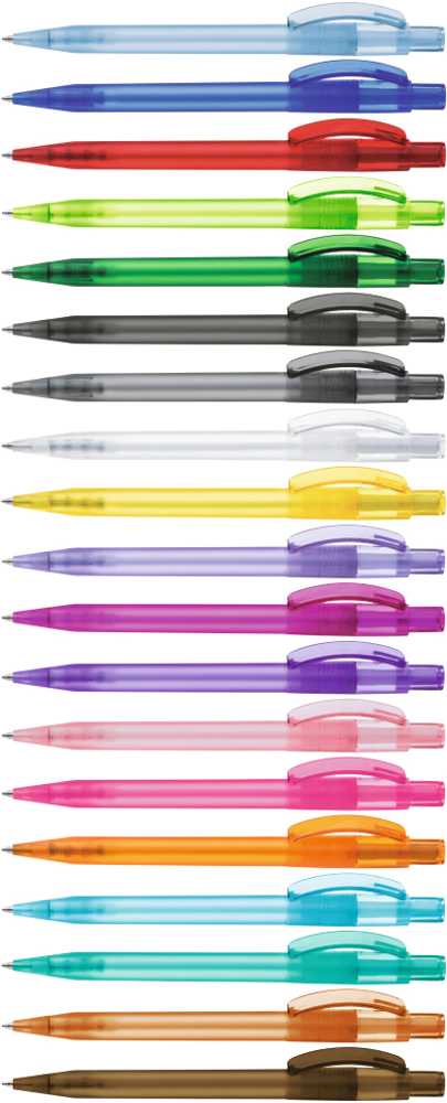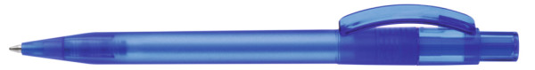 Druckkugelschreiber mit gefrostetem Gehäuse, glänzend transparentem Bogenclip und Drücker. mehr