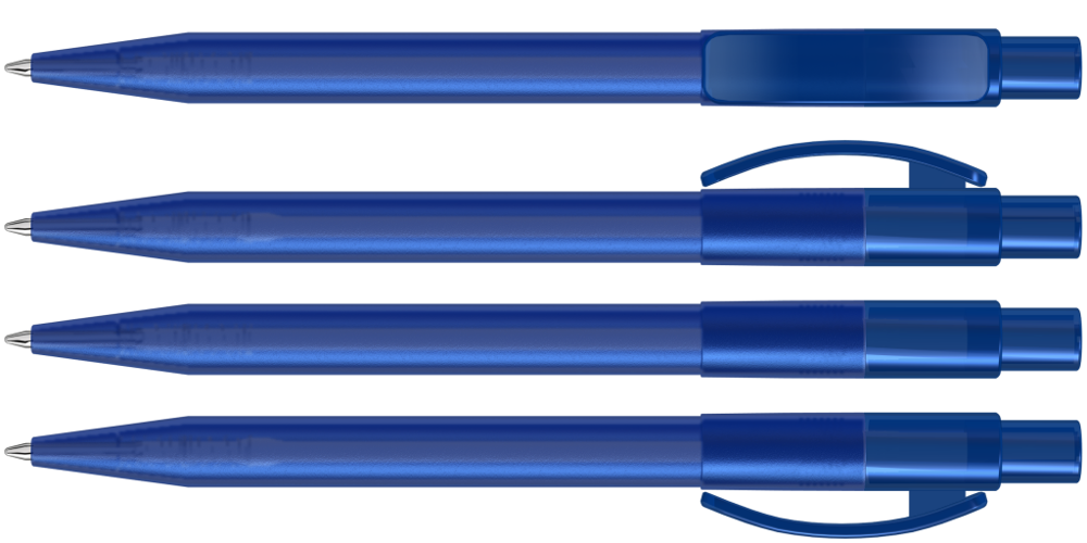 Druckkugelschreiber mit gefrostetem Gehäuse, glänzend transparentem Bogenclip und Drücker.