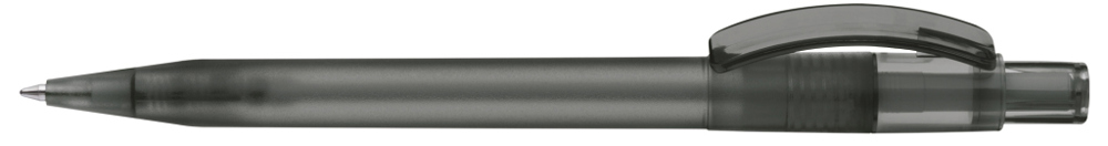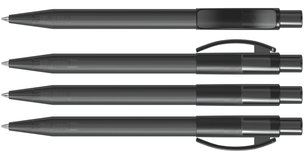 Druckkugelschreiber mit gefrostetem Gehäuse, glänzend transparentem Bogenclip und Drücker.