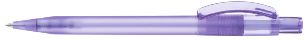 Druckkugelschreiber mit gefrostetem Gehäuse, glänzend transparentem Bogenclip und Drücker.