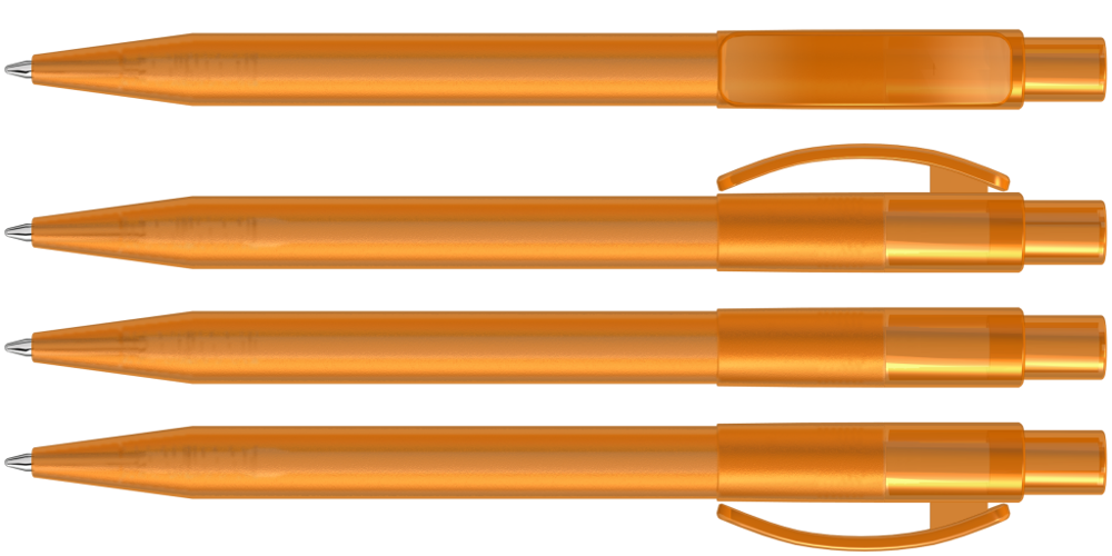 Druckkugelschreiber mit gefrostetem Gehäuse, glänzend transparentem Bogenclip und Drücker.