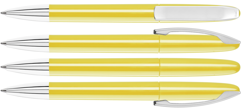 Drehkugelschreiber mit gedeckt glänzendem Gehäuse, Metallclip und Spitze glanzverchromt.