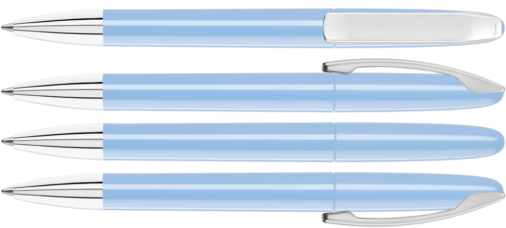 Drehkugelschreiber mit gedeckt glänzendem Gehäuse, Metallclip und Spitze glanzverchromt.