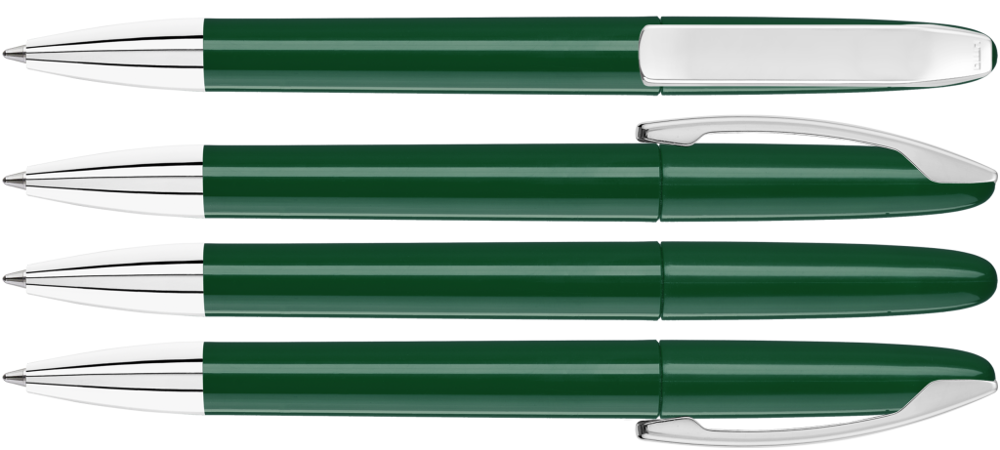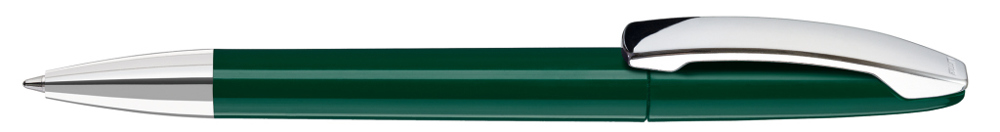 Drehkugelschreiber mit gedeckt glänzendem Gehäuse, Metallclip und Spitze glanzverchromt.