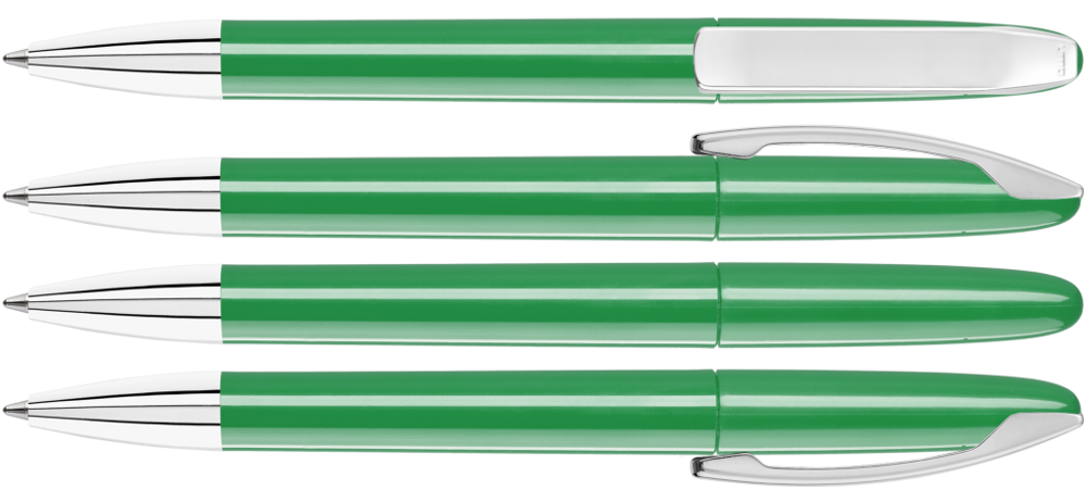 Drehkugelschreiber mit gedeckt glänzendem Gehäuse, Metallclip und Spitze glanzverchromt.