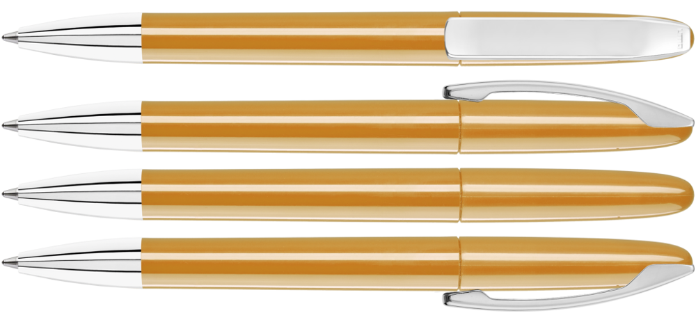 Drehkugelschreiber mit gedeckt glänzendem Gehäuse, Metallclip und Spitze glanzverchromt.