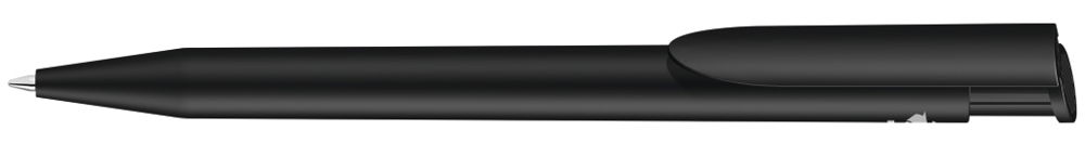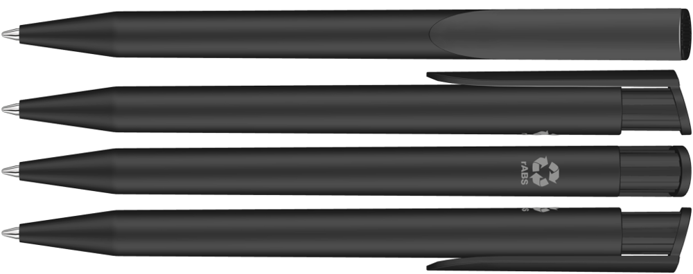 Druckkugelschreiber mit gedeckt mattem Gehäuse und Clipdrücker aus recyceltem Kunststoff.