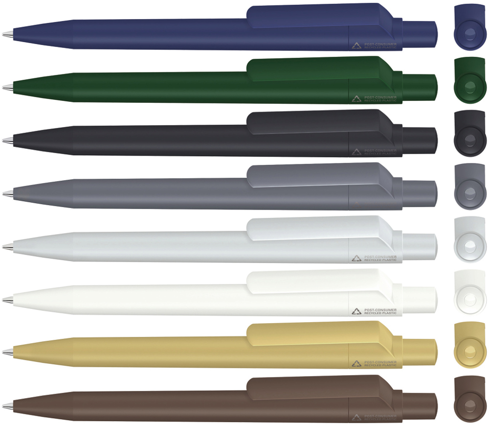 Druckkugelschreiber mit gedeckt mattem Gehäuse, Clip, Drücker und Stopfen aus 100% recyceltem Post-Consumer-Kunststoff.