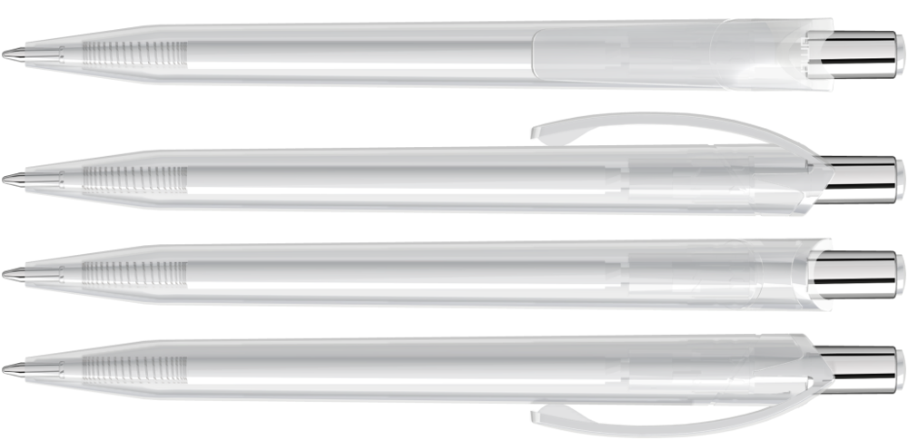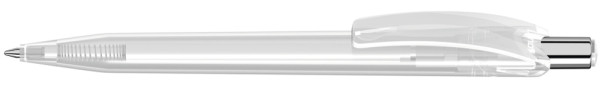 Druckkugelschreiber mit glänzend transparentem Gehäuse und Drückerstopfen. Drücker in silber glänzend.