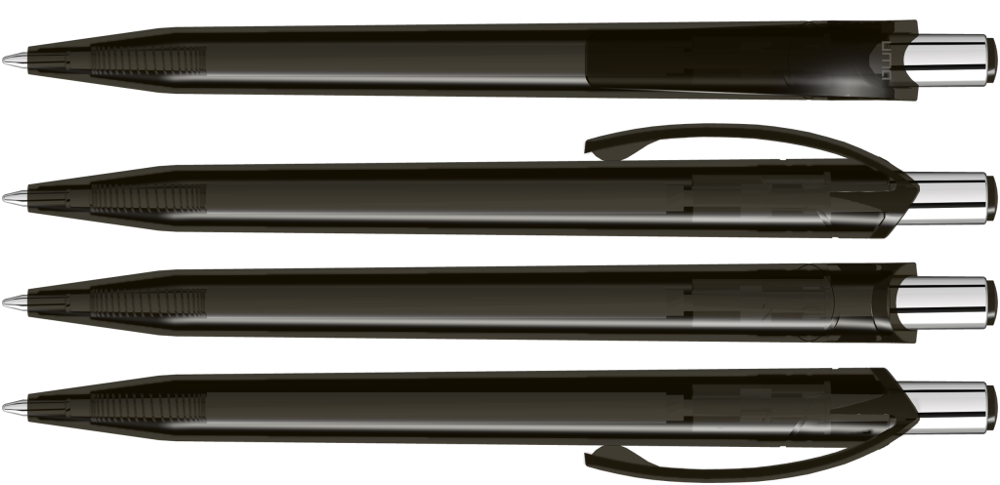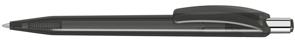 Druckkugelschreiber mit glänzend transparentem Gehäuse und Drückerstopfen. Drücker in silber glänzend.