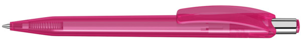 Druckkugelschreiber mit glänzend transparentem Gehäuse und Drückerstopfen. Drücker in silber glänzend.